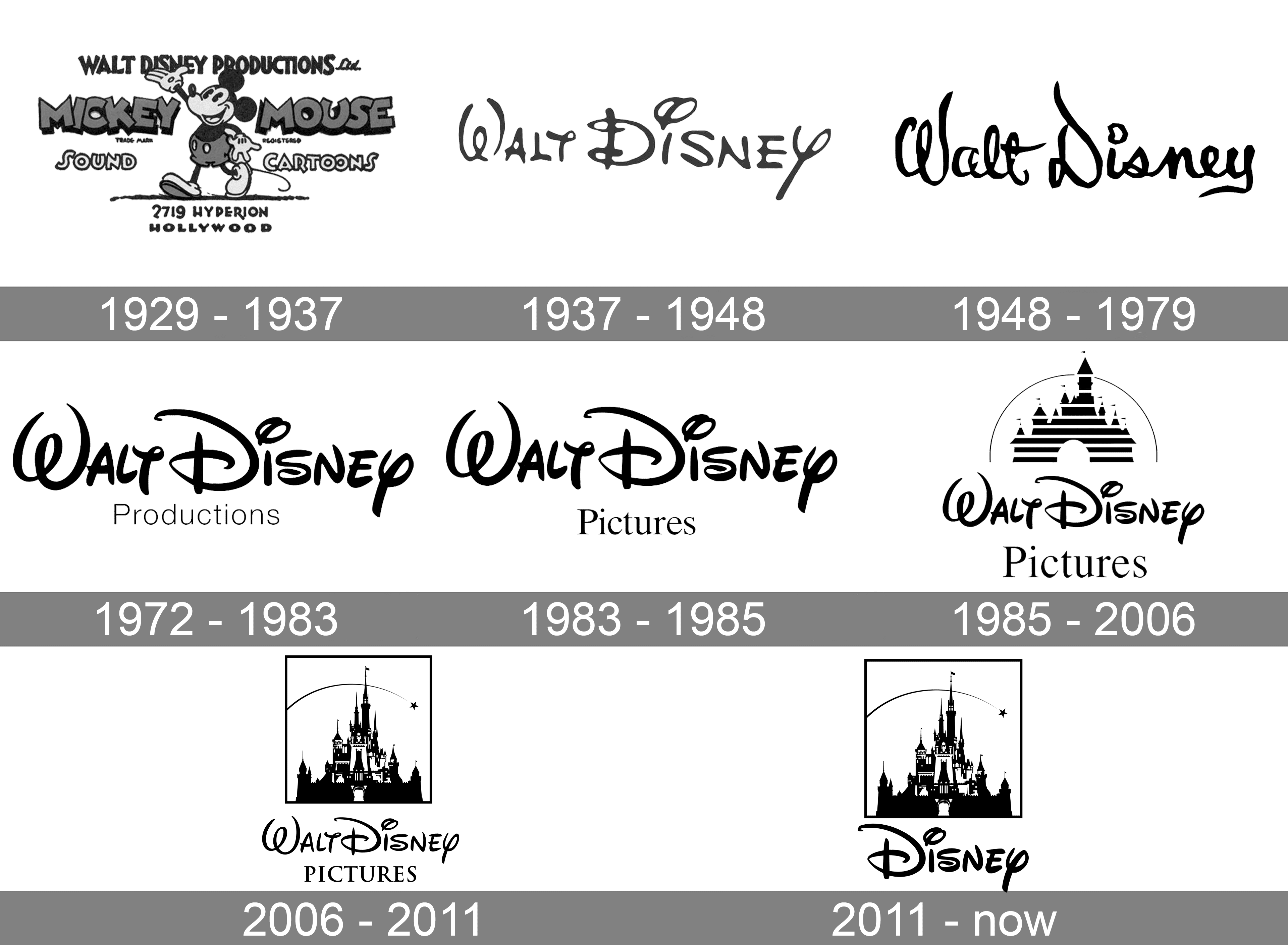 While the lettering “Walt Disney” remained unchanged, the word “Productions” was replaced by “Pictures.” This time, the design team opted for a serif type and made the letters larger.