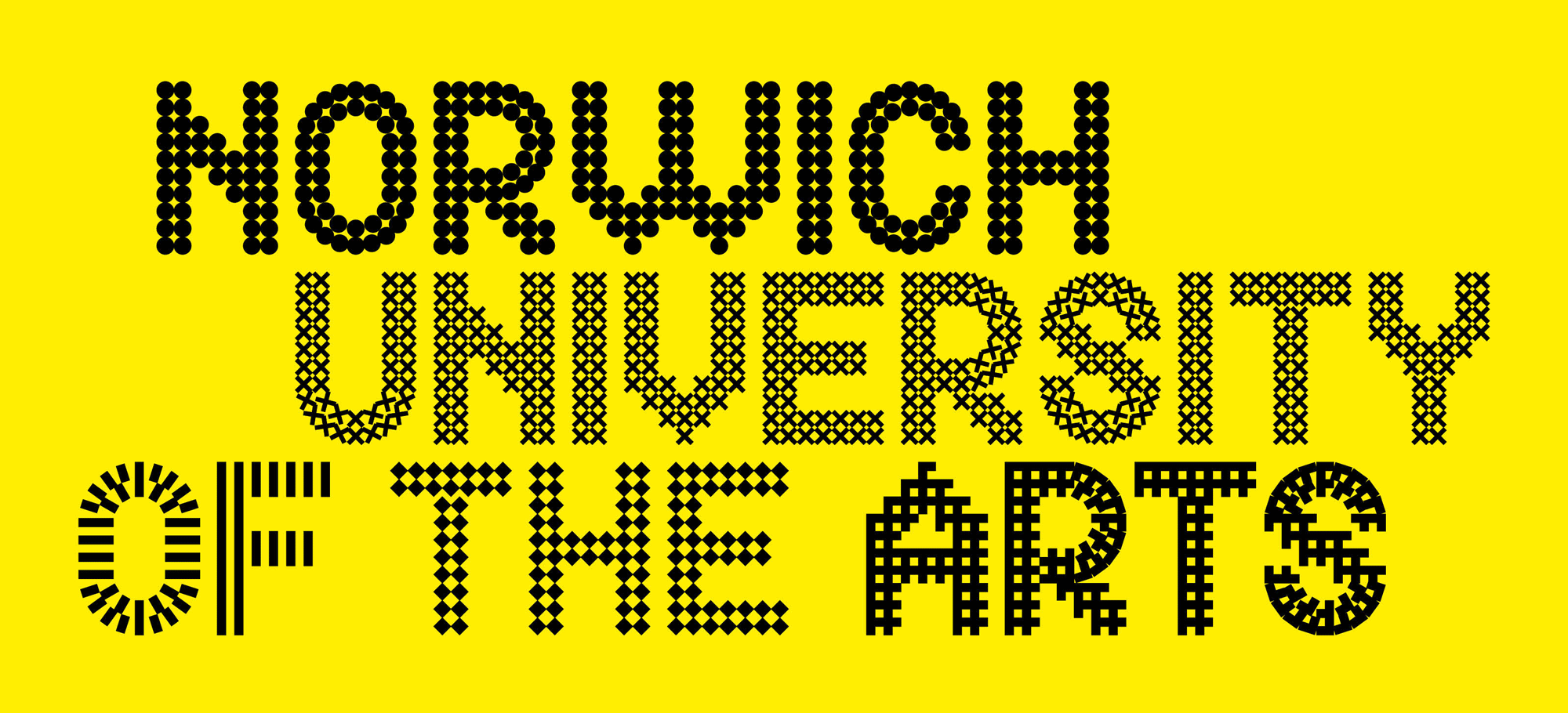At the heart of the refreshed identity is the striking new logo. Retaining the signature yellow from the previous design, the updated logo takes the form of a wordmark styled as a patchwork of graphic patterns. Each letter in “Norwich University of the Arts” is composed of distinct designs, including circles, crosses, stripes, and diamonds. We saw something similar in the Calgary visual identity project. These patterns represent the diverse disciplines taught at NUA and embody the university’s commitment to artistic diversity.