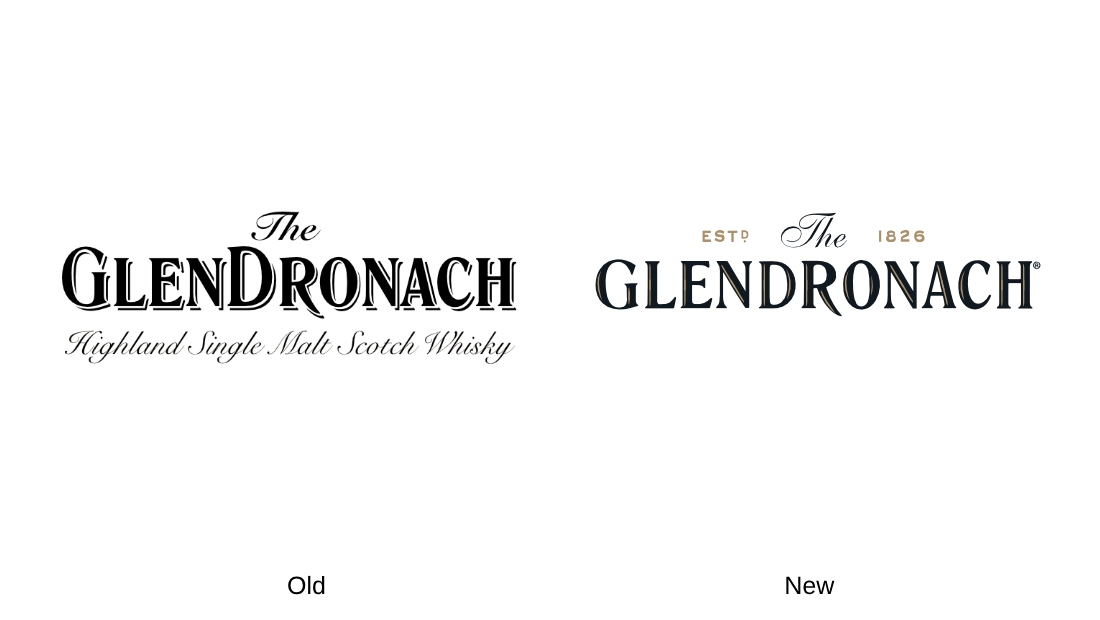 The new brand mark showcases significant changes. The Glendronach wordmark has adopted a different typeface with subtler serifs, dropping the shadow effect in the letters. The “G” and “D” are now aligned with the other letters, giving the inscription a thinner and more refined appearance. A distinctive feature is the slightly elongated leg of the “R.” Additionally, the logo has discarded the calligraphic tagline “Highland Single Malt Whiskey” beneath the wordmark. Instead, “Est. 1826” has been added above the wordmark, emphasizing the brand’s heritage.