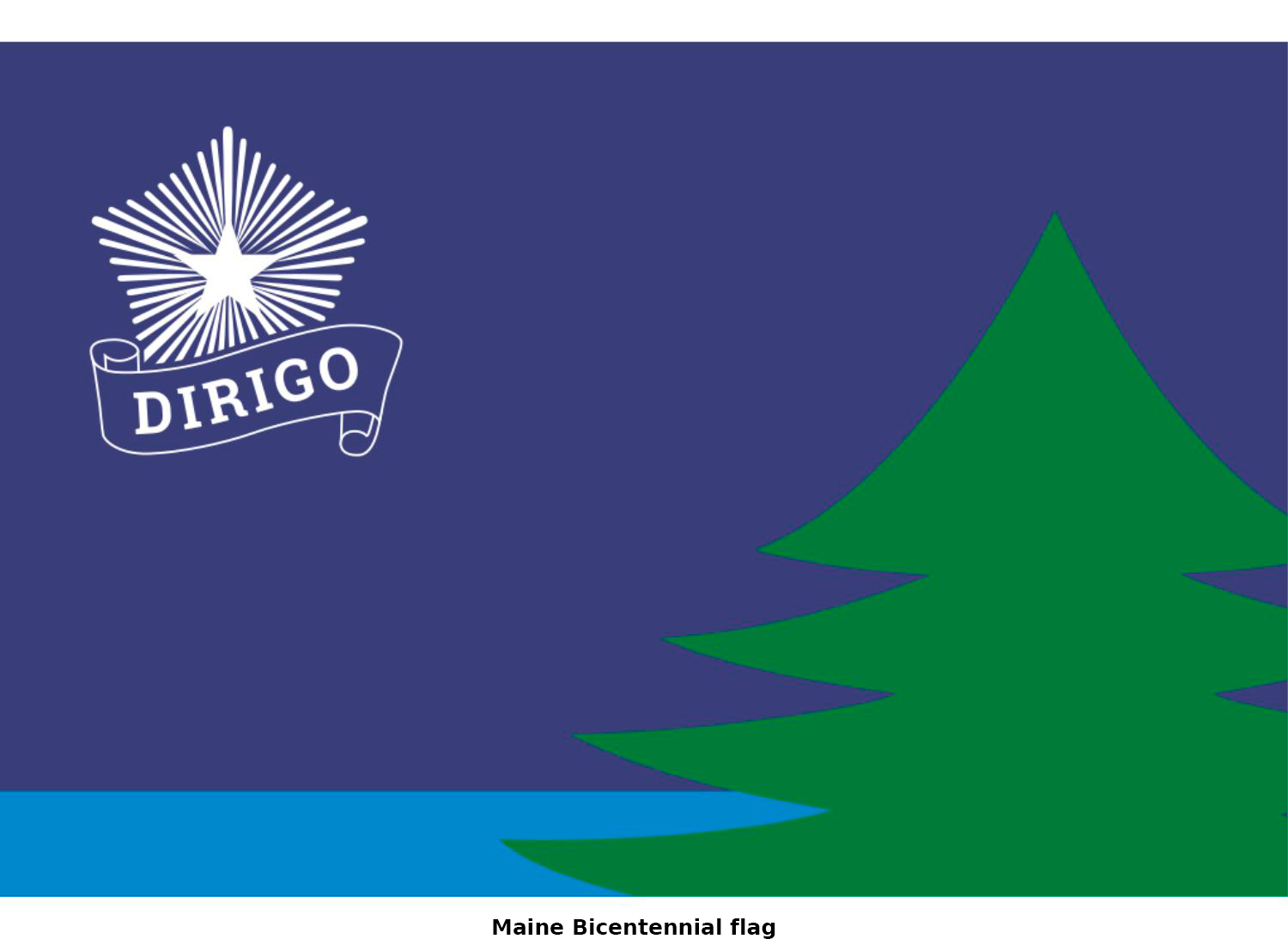 Maine’s current flag, like the old flags of Utah and Minnesota, can be considered graphically overloaded, featuring the state’s coat of arms. The composition includes a farmer and a seaman, symbolizing the state’s traditional reliance on agriculture and the sea. The central part depicts a moose resting under a pine tree. The figures are complemented by a red banner on top with Maine’s motto “Dirigo,” meaning “I lead,” and a blue banner at the bottom featuring “Maine.”