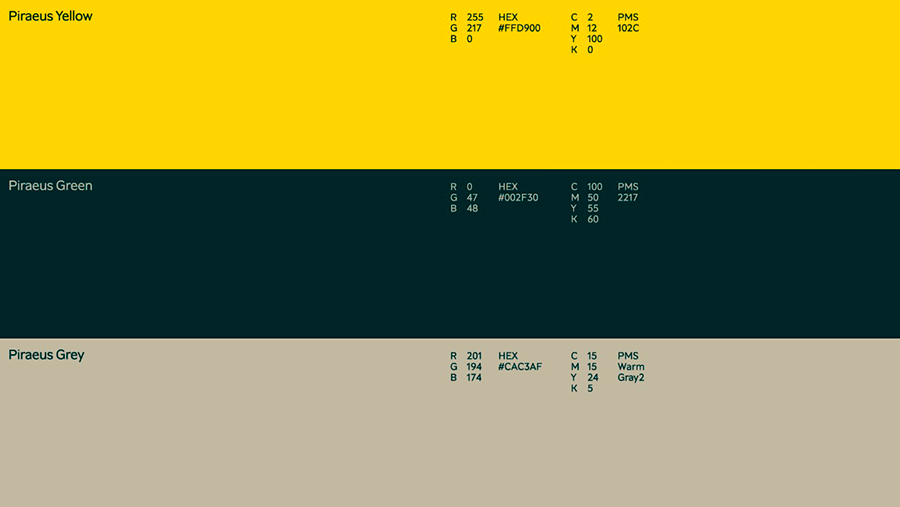 The new color palette prominently features yellow, previously a secondary color in the old brand identity. Named Piraeus Yellow, this bright hue is complemented by pine green (Piraeus Green) and yellowish gray (Piraeus Gray), creating a unique gamma with contrasting colors that ensure optimal readability across various combinations.