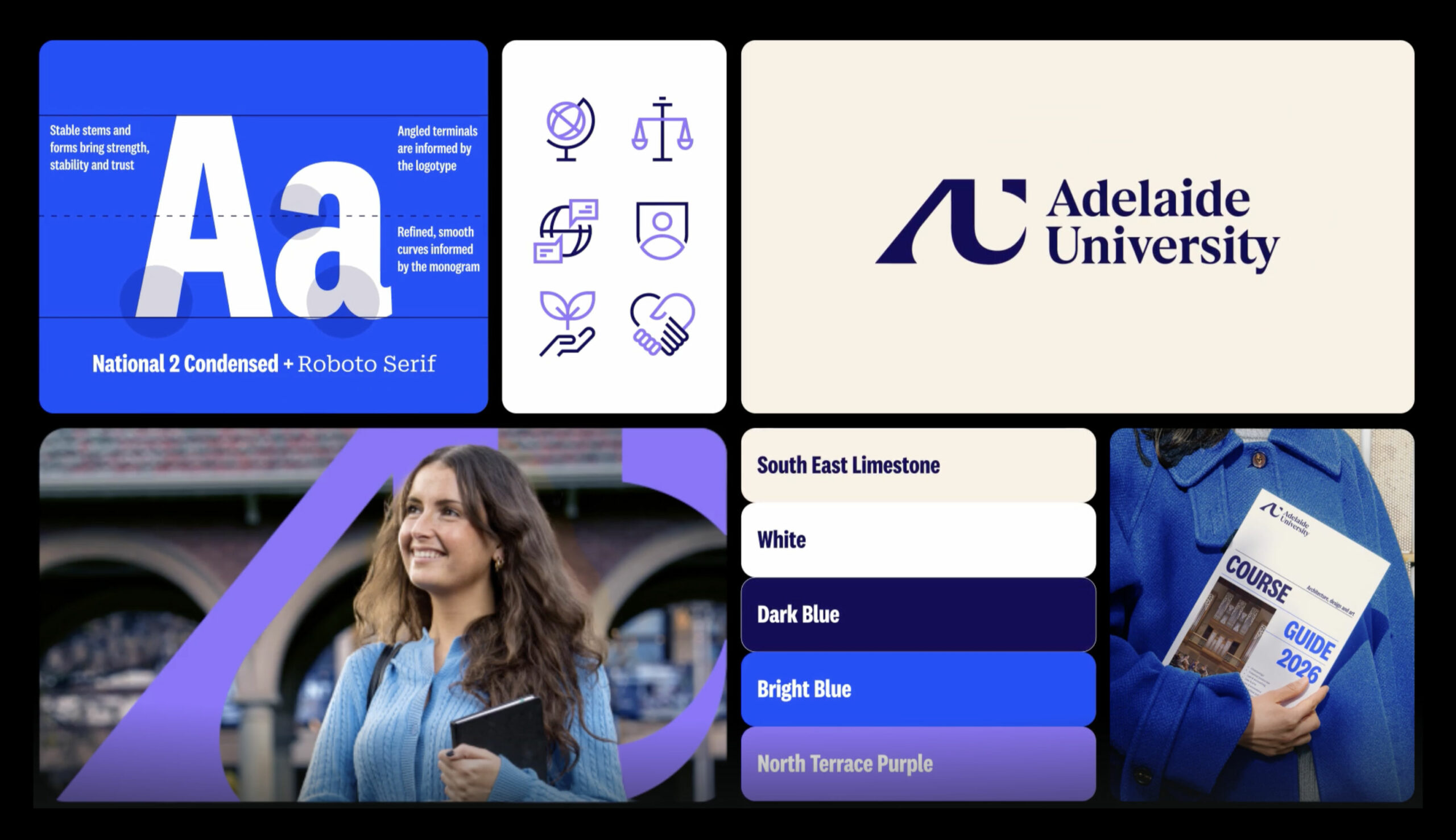 The AU icon is accompanied by a two-line wordmark executed in the National 2 Condensed serif font from the New Zealand Klim Type foundry. While the two-line structure continues the aesthetics of the University of Adelaide and UniSA, the choice of a serif typeface adds a sense of seriousness and solidity to the brand.Another important aspect is the choice of dark blue as the main brand color. Often found in educational contexts, this hue in AU visuals is complemented by accent shades such as ivory, bright blue, and purple. Utilized in the design of the university’s website, this color scheme feels fresh and inspiring.
