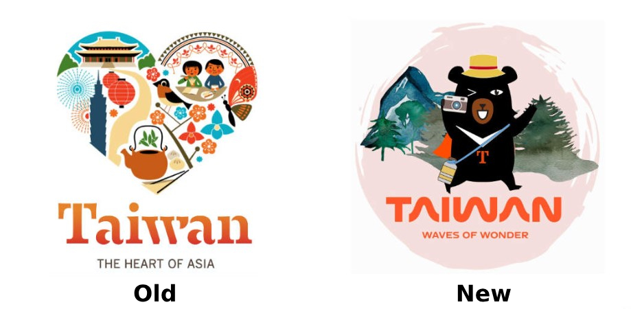 On the other hand, the new branding is certainly more thoroughly conceived. The waves are a simple and elegant solution deliberately connected with the island’s assets, somewhat reminescent of the NASA worm logo. The wavy motif is also reproduced in branded images featuring great views of Taiwan. And that’s a really modern and appealing design. A similar consistency is found in the brand’s main image featuring an Asian black bear as a tourist against a backdrop of mountains and trees.