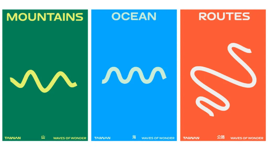 The tourism brand logo includes a wordmark with wavy letterforms. According to an original concept, this represents Taiwan’s mountains, ocean waves, curvy rivers, routes, and railroads. The orange shade is inherited from the previous logo to continue the brand’s visual tradition conveying warmth and the vital power of Taiwan.