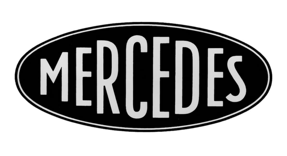 The very first Mercedes logo was composed of a strict oval badge, which was located horizontally and featured a bold sans-serif wordmark, where all the letters were in different sizes, enlarging to the center and then getting smaller to the right. The badge had a double outline and was executed in monochrome for documents and dark blue with silver for the emblem.