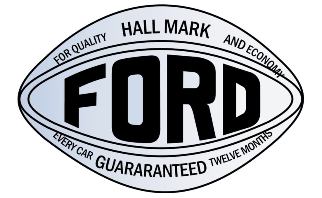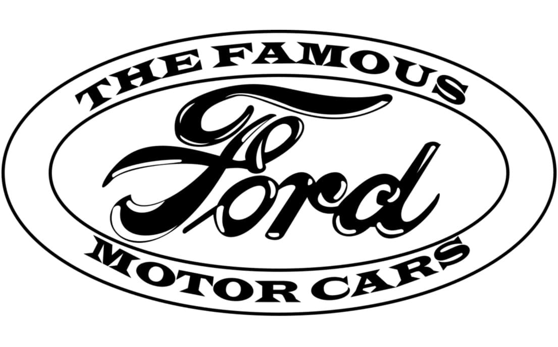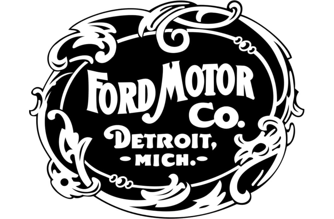 The very first logo of the Ford Motor Company was composed of an ornately rounded badge in a frame with leaves and curves. The badge was colored black and has a white inscription on it, accompanied by a white framing. The letters were arched and placed in a wave, with the “Detroit, Michigan” tagline in a bold sans-serif typeface. It was the tradition for its time emblem, very elegant and simple.