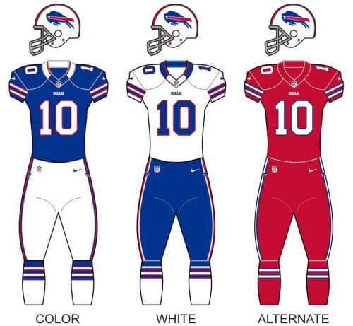 The very stylish and patriotic uniform of the Buffalo Bills football club is based on a color palette, composed of four shades: royal blue, navy blue, white and red. The main uniform features a royal blue jersey with white and red details, and white pants, with red and blue stripes. There is also a white uniform, withblue pants and red and white stripes, and the alternate version of the uniform: all red with white and navy blue accents.