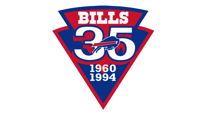 For the 35th anniversary, the sharp and strong emblem was introduced: it was an edgy crest formed by two overlapping triangular segments, pointing down and with their top borders arched from the center. The smaller one was set in red and overlapped the solid blue one on its upper part. The main element here was the enlarged white “35” with the blue and red buffalo emblem on it. The uppercase white “Bills” was written on top of the crest, and the dates — at the bottom.