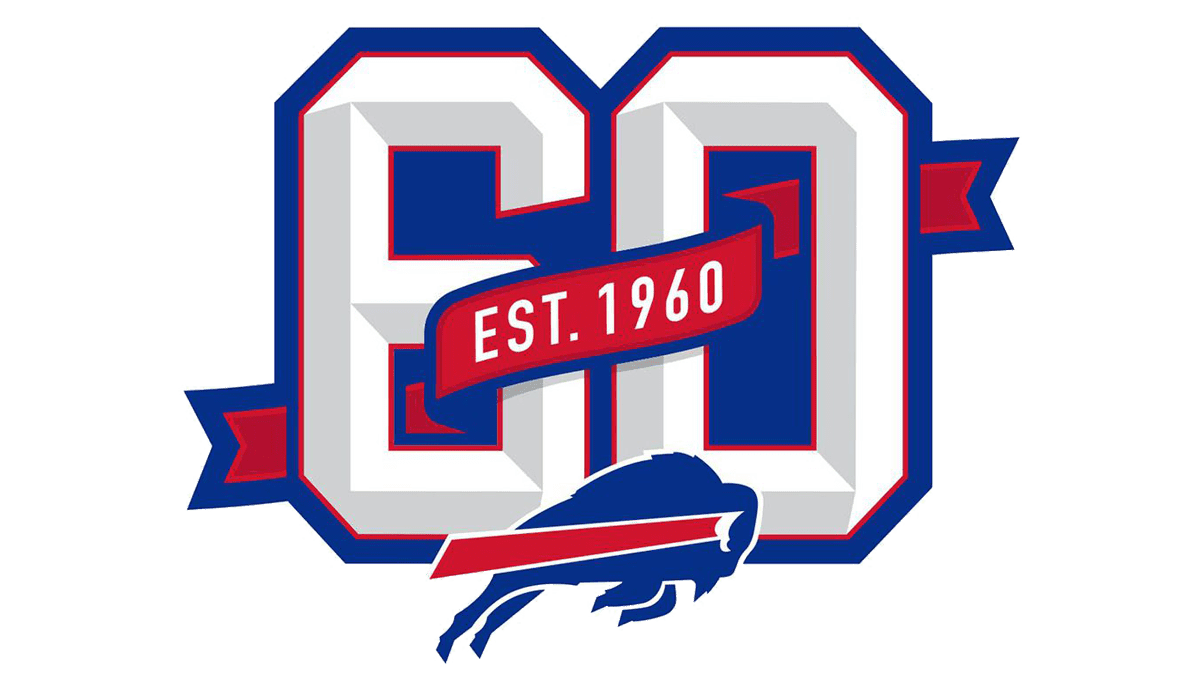 In 2019 to celebrate the 60th anniversary of the Buffalo Bills franchise, a strong and progressive emblem was created. The white voluminous “60” outlined in red and placed against a solid blue background, has its digits intertwined by a fancy red ribbon with the blue framing and the white “Est. 1960” datemark. The iconic emblem, depicting a blue buffalo with a red stripe, is set at the bottom of the badge.