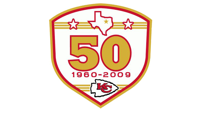 The 50th season of the Kansas City Chiefs franchise was marked by a new emblem in 2009. A classy white crest in a double red and gold outline had the enlarged golden “50” in the center, enclosed between the three horizontal golden lines with the contours of the state and two stars on top, and a datemark with the club’s official logo at the bottom.