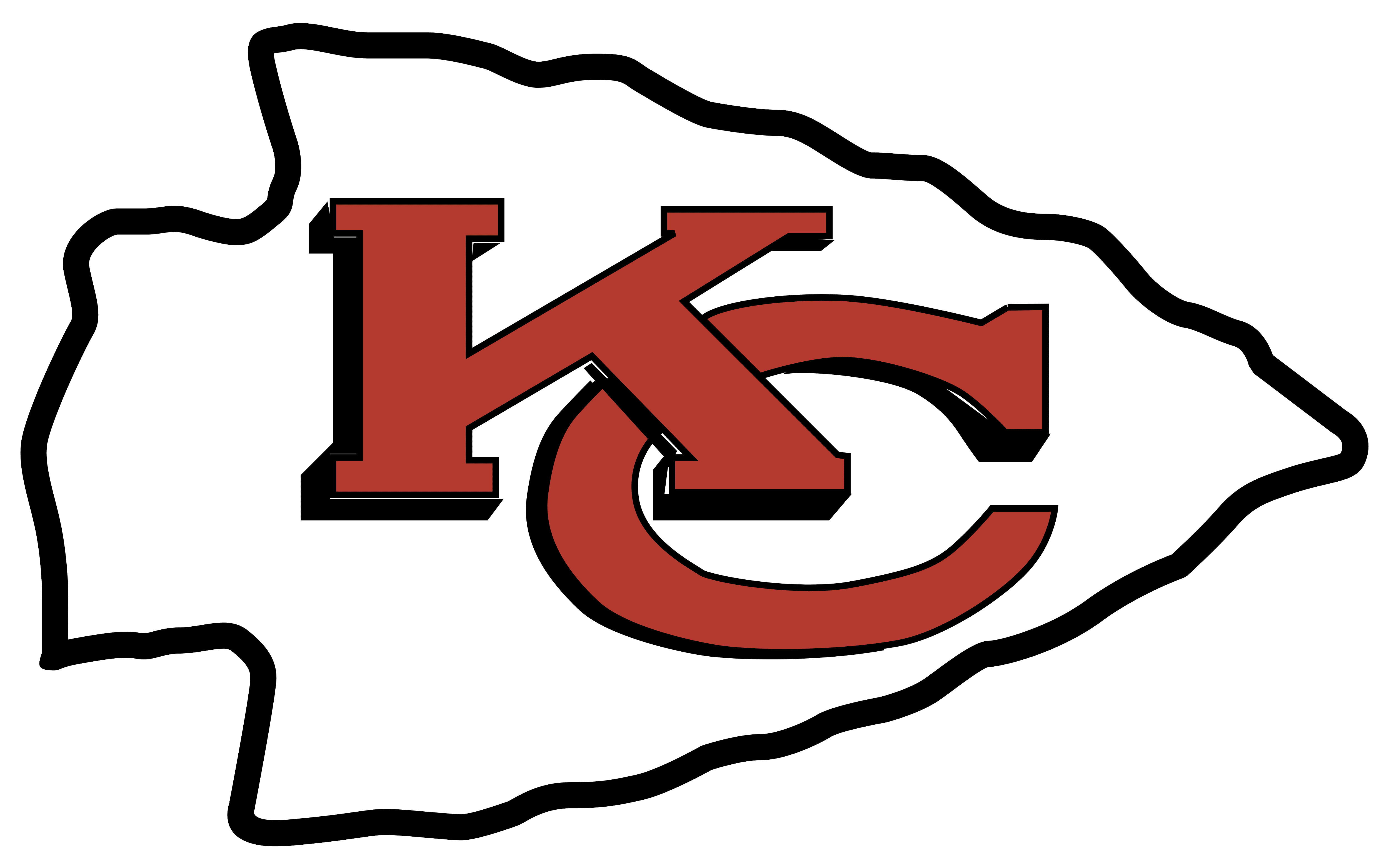 Today, the Chiefs logo are the interlocking cherry-red “KC” inside a white arrowhead-like figure. The arrowhead’s contour is black and chipped.