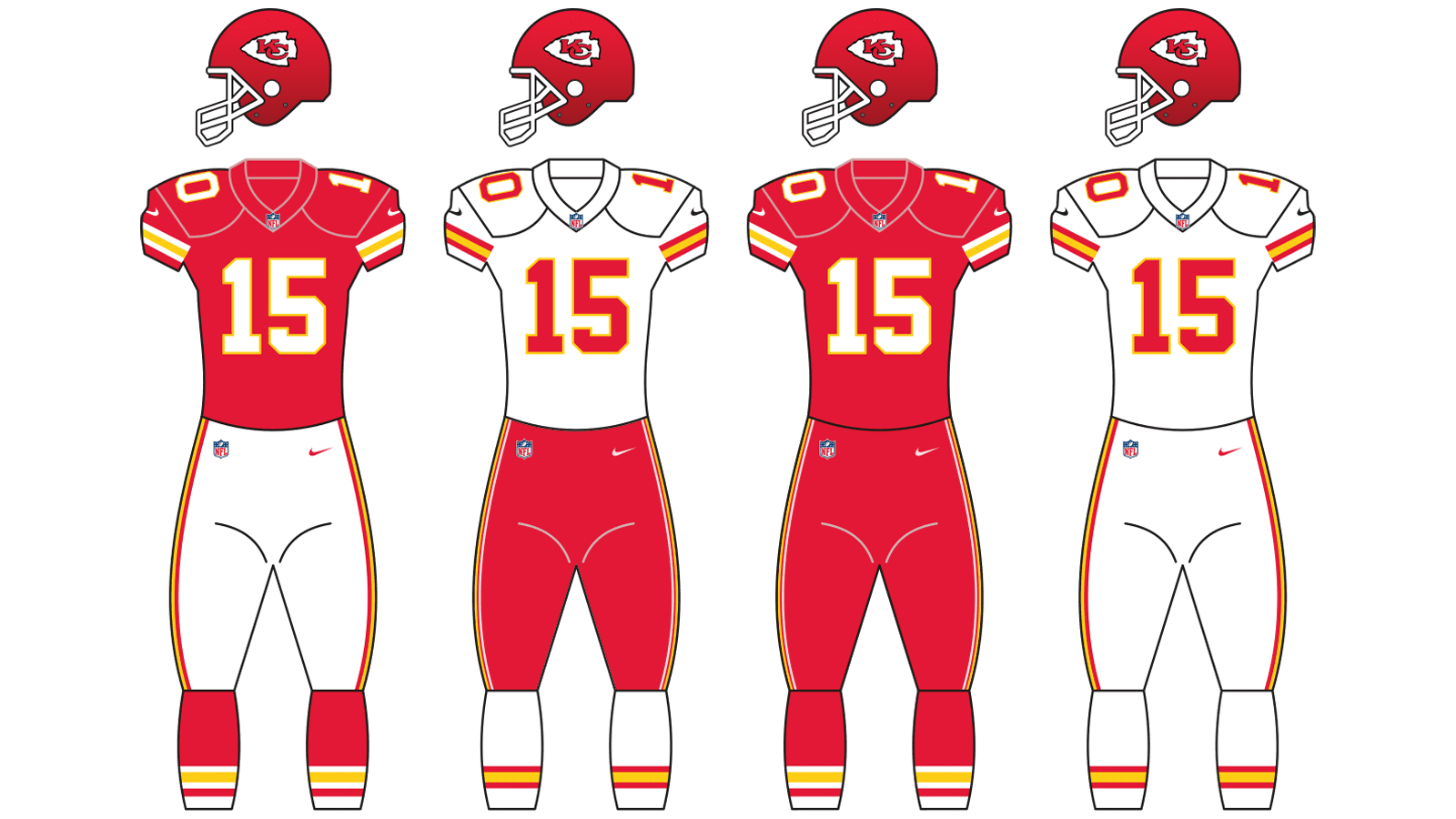 The professional football club from Kansas City has one of the brightest uniform color palettes of the NFL. It is based on a combination of red, white, and golden-yellow, with some black contours and small accents.