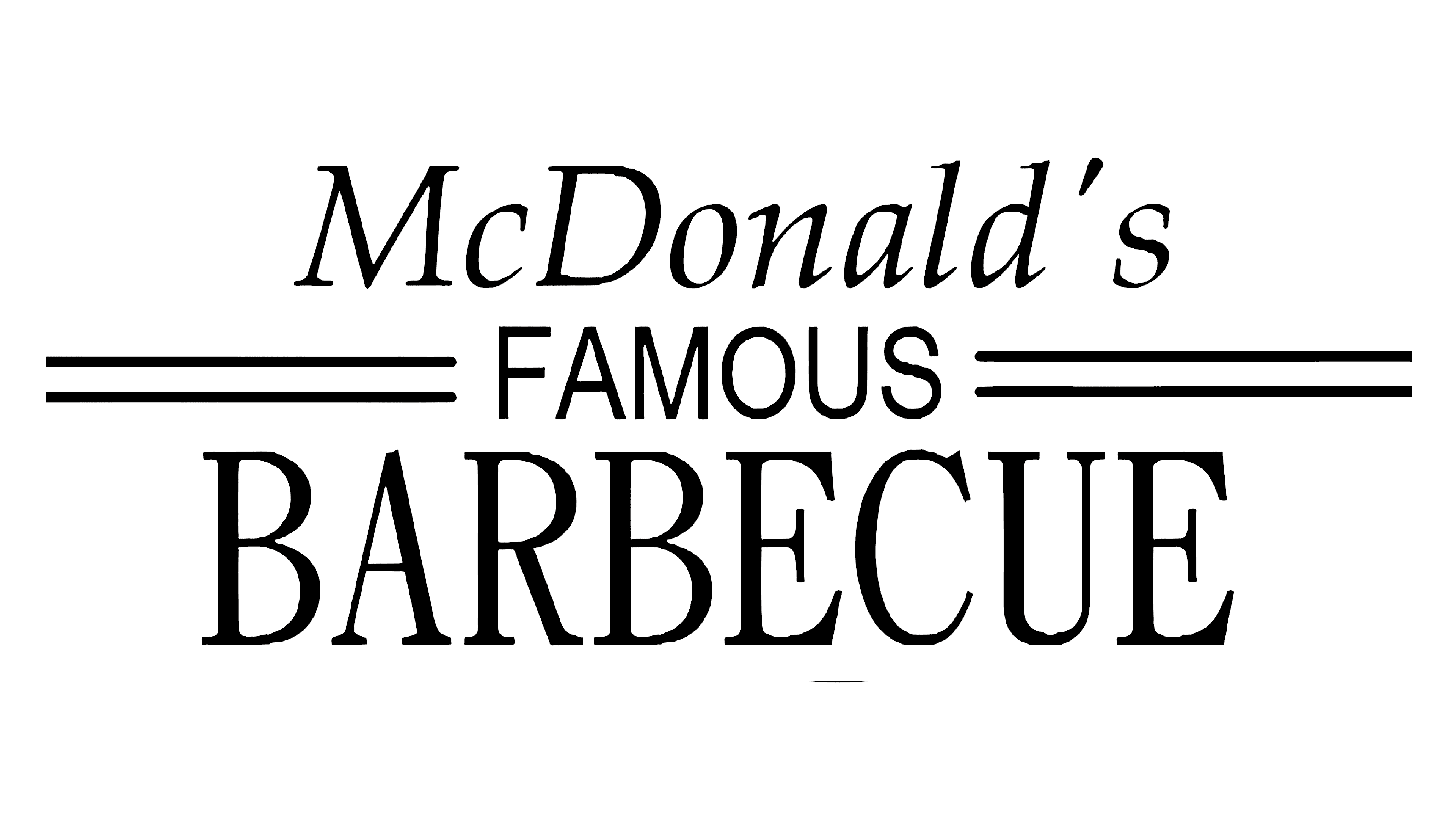 The upper part featured the “McDonald’s” inscription in an italicized serif font, which was elegant and traditional. The “Famous” in all capitals was written in sans-serif and placed in the middle and had two parallel horizontal lines coming out of it to both right and left. As for the biggest and boldest part of the whole logo, the “Barbecue” inscription, was executed in a strict and solid serif font and located on the lower level of the logo, being its main part.