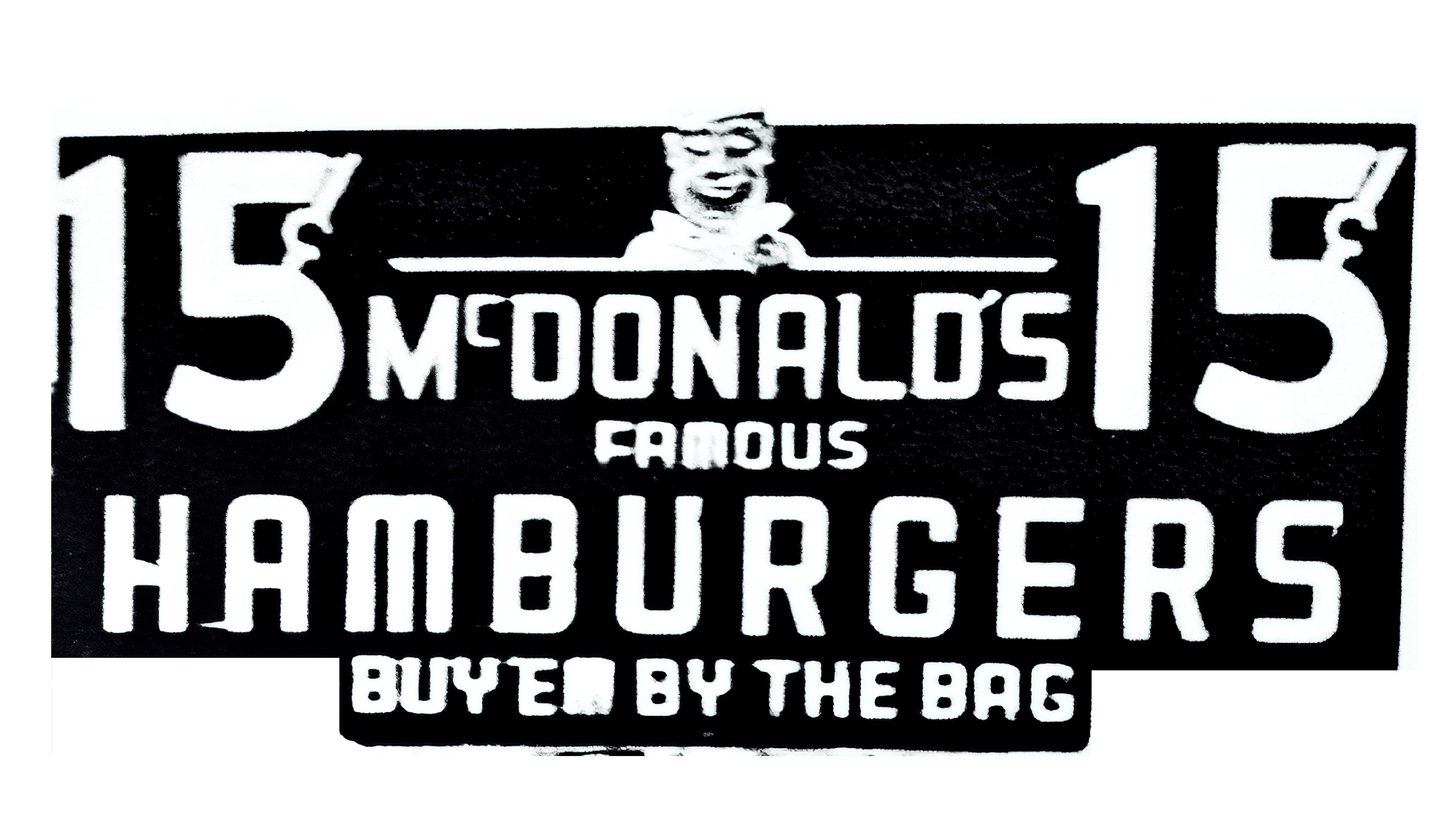 The Barbecue concept was replaced by Hamburgers, which were getting more and more popularity in the USA. The title of the restaurant was altered in 1948 and the logo was redesigned. It was now composed of a white “MacDonald’s Famous Hamburgers” nameplate on a black background, with a small white image of the Chef, who was friendly smiling. The inscription was executed in one style, using a modern sans-serif typeface. This logo only lasted for 5 years.