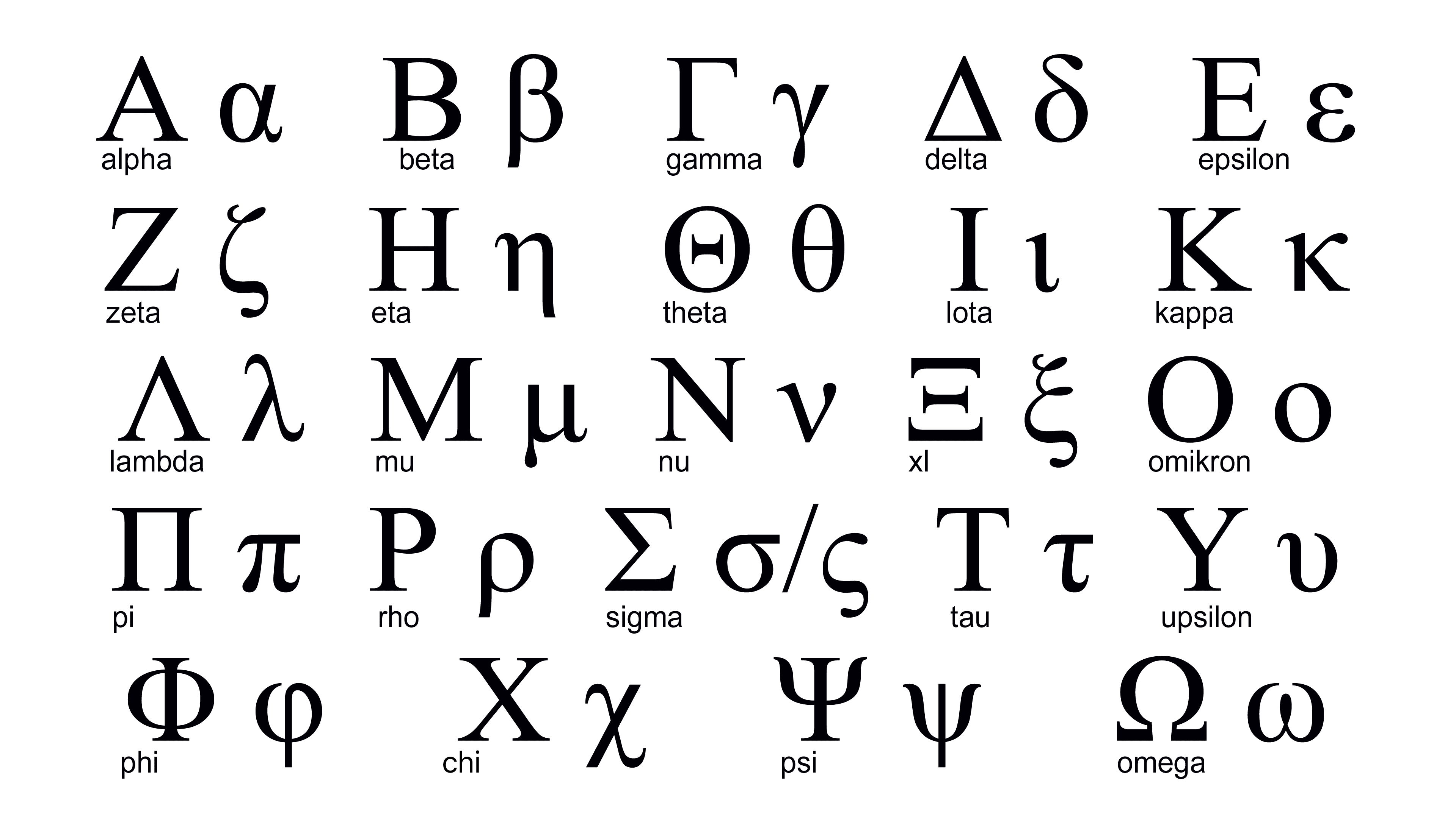 Μ μ – originated from the Phoenician letter “meme” and gave the name to the Latin M and Cyrillic M (μῦ, mu). Used to denote quantities in mathematics, physics, thermodynamics.