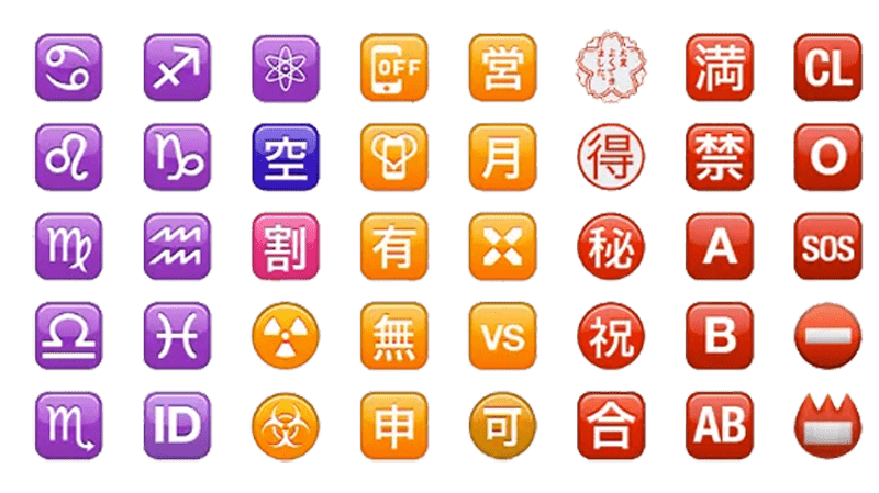 Of course, these are not even 10% of all the emoji in existence today, but they are definitely the most commonly used. Below we want to separate the emoji with Japanese characters into a separate group, because they are still included in every basic emoji set.
