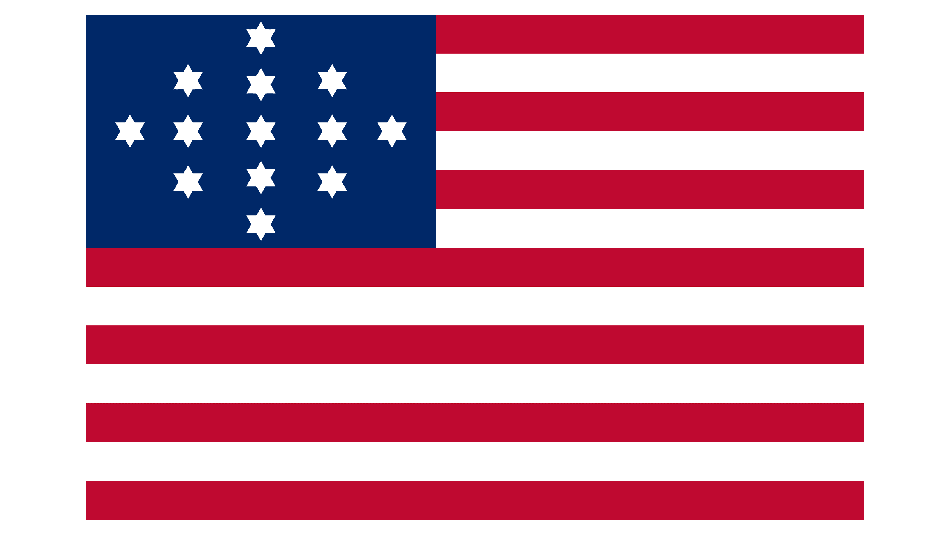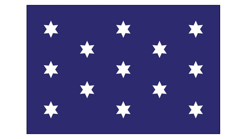 The thirteen white six-pointed stars are arranged into the shape of a rhombus on a solid blue background in the upper left corner of the Hulbert Flag, named after Captain John Hulbert.