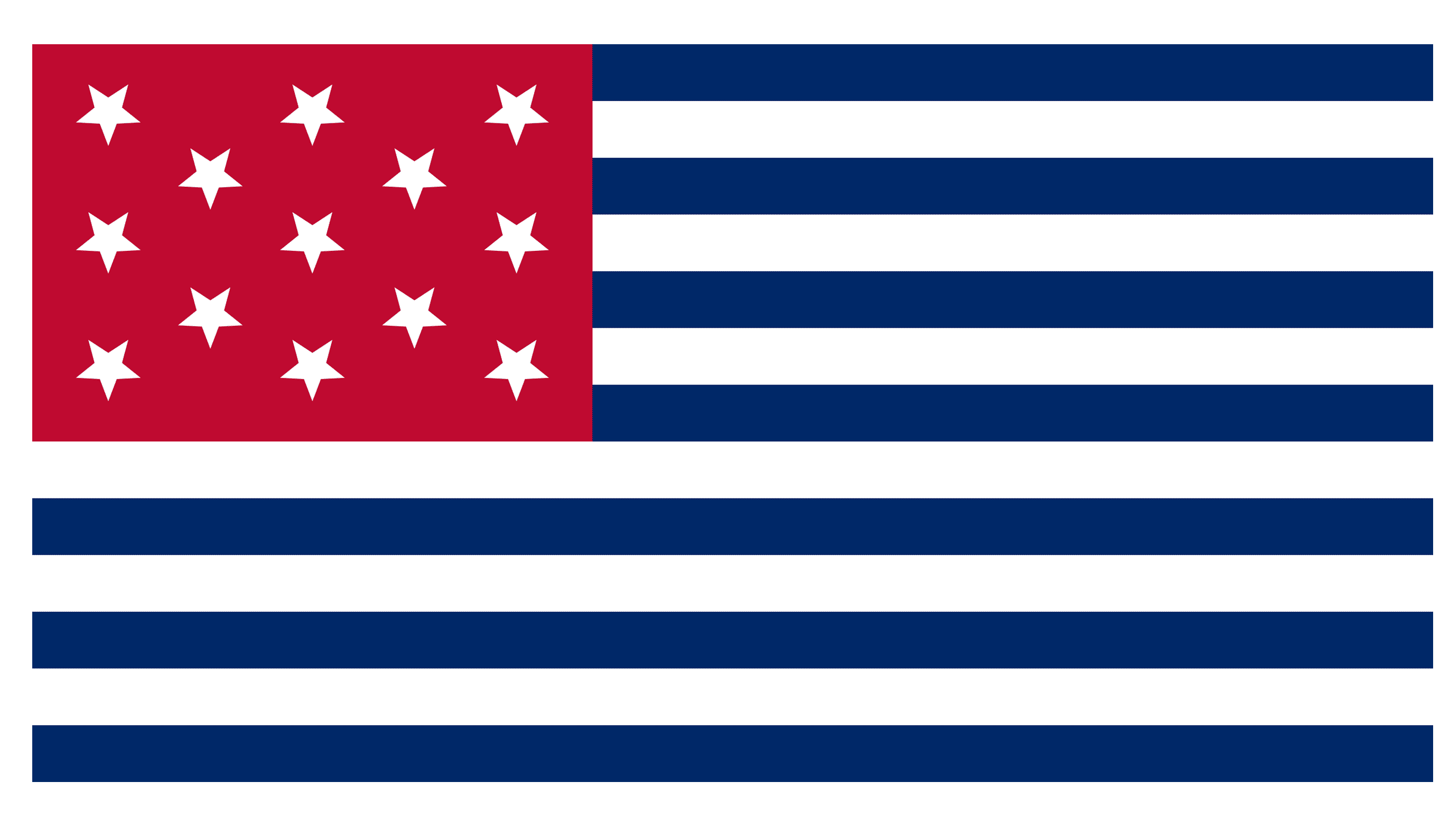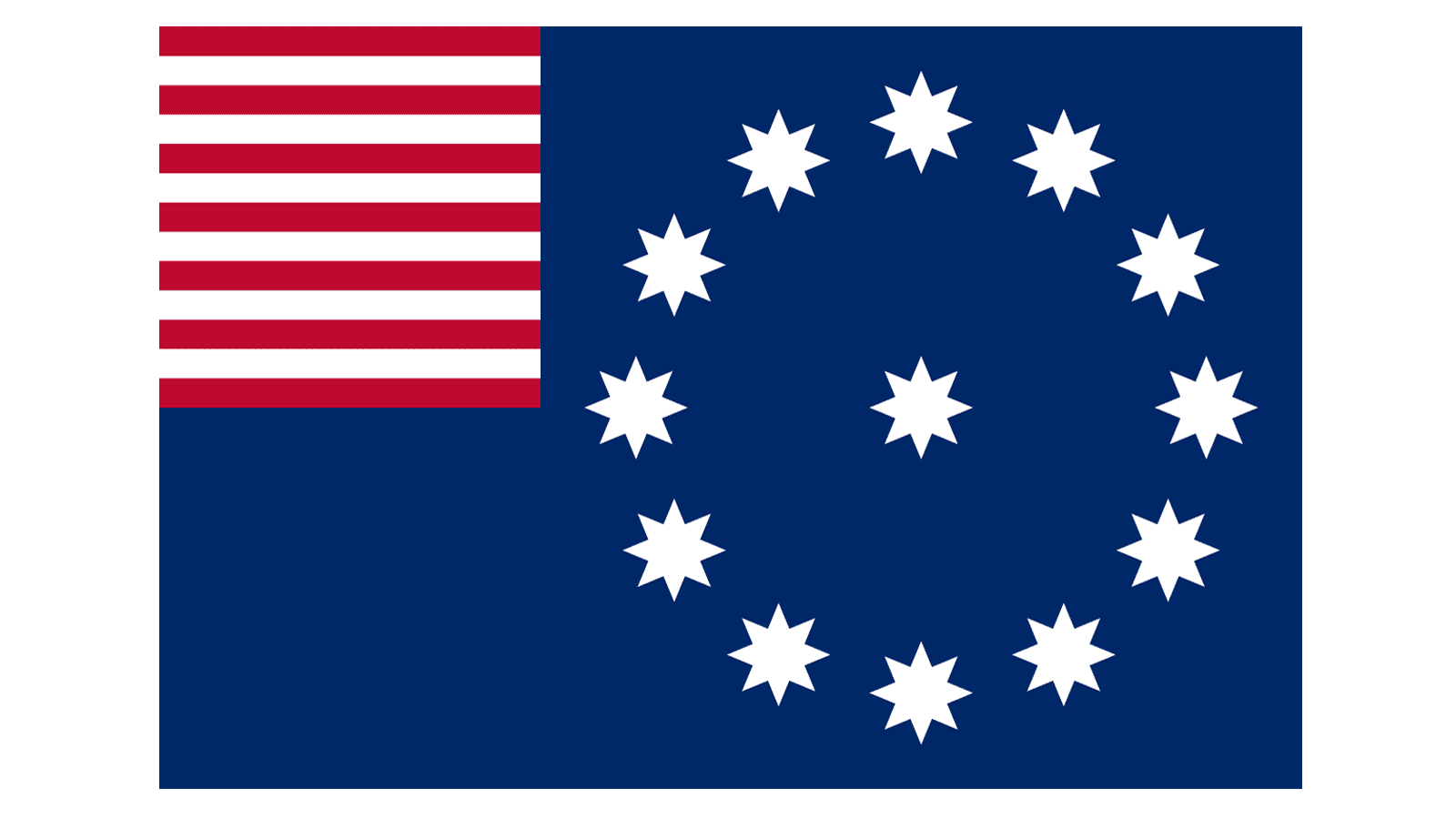 The Guilford Flag was somewhat different: stretched horizontally, it featured a striped pattern in blue and red and a huge white rectangle with thirteen enlarged eight-pointed stars in solid blue.