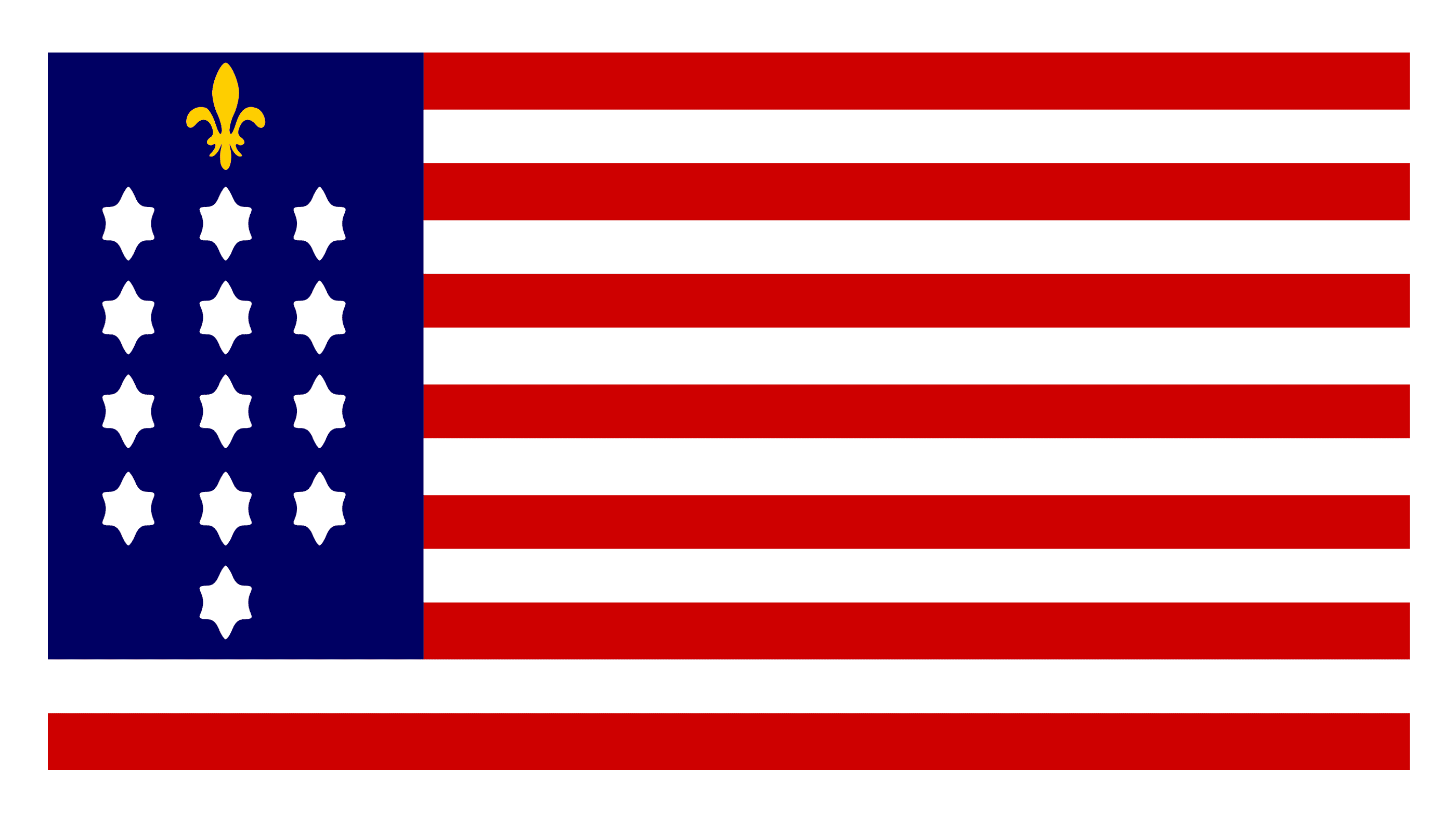 The French Alliance Flag introduced in 1781, featured a slightly modified composition: the blue segment was stretched vertically, taking almost all the height of the flag. The stylized white stars were set in four levels of three, with the thirteens set at the very bottom. The golden fleur-de-lys emblem, the symbol of France, was set on top of the stars, creating a symmetrical image.
